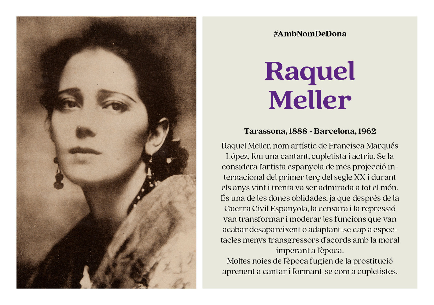 Raquel Meller, nom artístic de Francisca Marqués López, fou una cantant, cupletista i actriu. Se la considera l’artista espanyola de més projecció in- ternacional del primer terç del segle XX i durant els anys vint i trenta va ser admirada a tot el món. És una de les dones oblidades, ja que després de la Guerra Civil Espanyola, la censura i la repressió van transformar i moderar les funcions que van acabar desapareixent o adaptant-se cap a espec- tacles menys transgressors d’acords amb la moral imperant a l’època.